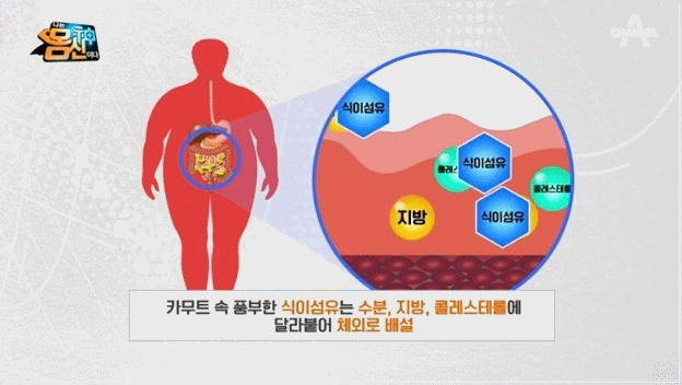 카무트 속에 있는 식이섬유는 지방 흡수를 돕는 담즙산과 결합해 배설하는 역할을 한다. 카무트를 섭취하게 되면 혈중 콜레스테롤 감소에 도움을 준다.