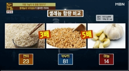 카무트 셀레늄 함량을 비교해보자. 현미 100g 셀레늄은 23, 마늘 100g당 셀레늄은 14, 카무트 100g에 셀레늄은 81이 들어있다. 카무트의 셀레늄 함량은 현미의 3배, 마늘에 5배이다.