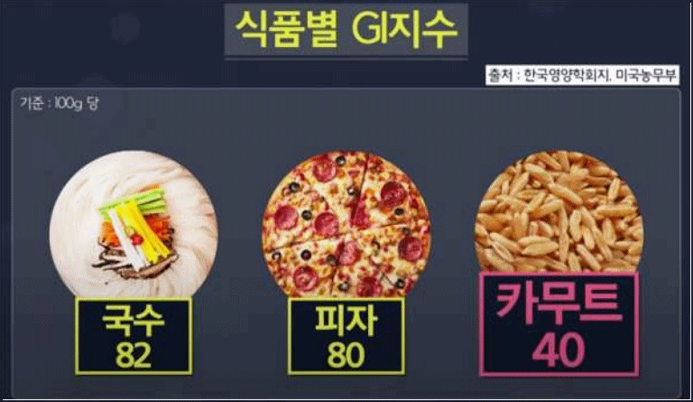 한국 영양학회지에 있는 식품별 혈당지수를 살펴보면, 국수 100g에는 82, 피자 100g에는 80, 카무트 100g에는 국수와 피자의 반인 40이다.